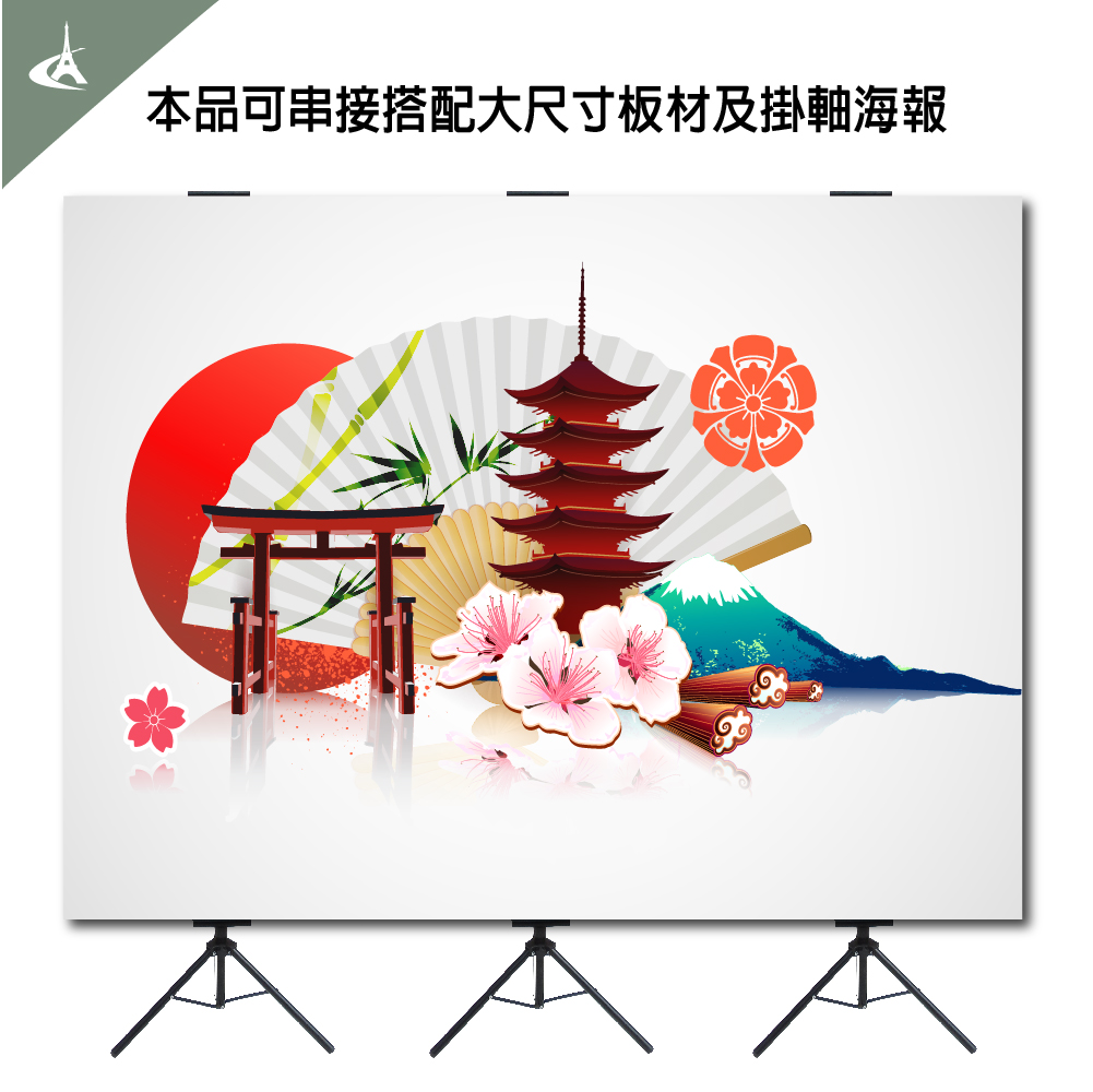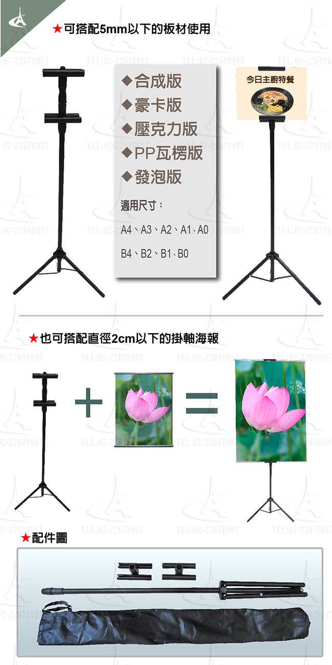 本款伸縮三腳立架輕便好移動,用途範圍廣、CP值超高,強烈建議客人可自行去附近文具行購買3~5mm厚的板材即可搭配使用,費用便宜、選擇多樣、一百元以內即可當告示牌或指示板使用(收納長度達120公分,請仔細評估可否方便攜帶)。
