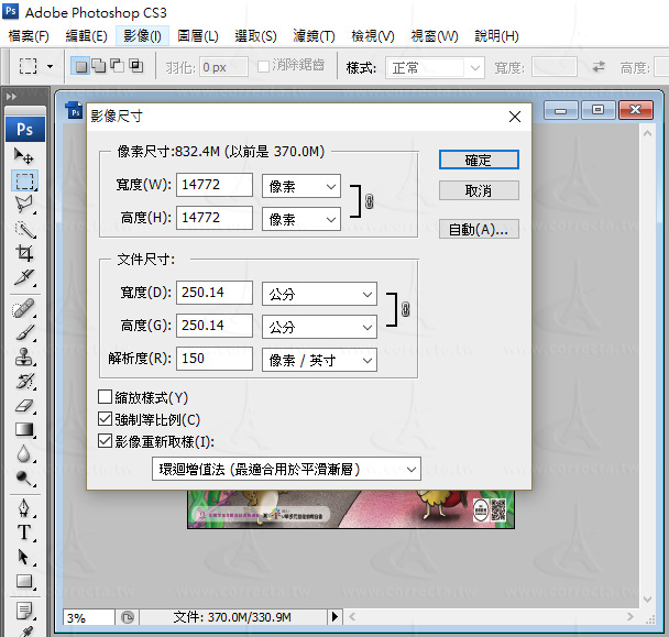 以下為利用Photoshop調整解析度示意圖,開啟圖檔後同時按鍵盤上的Ctrl + Alt + I或Command + Option + I(MAC電腦)。