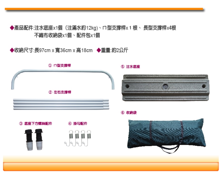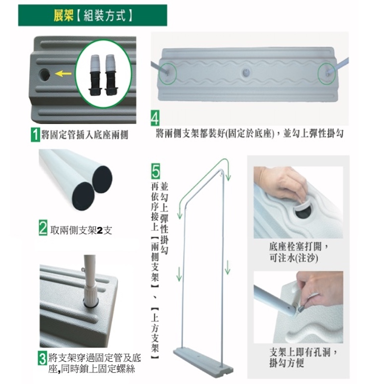 將鐵管插入水箱底座並鎖緊,逐一組合成門型後,接著將四角落彈簧掛勾固定並勾住海報,最後將底座注滿水即可增加穩固性。