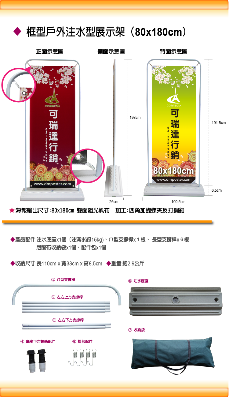 本注水門型展架可加水約15公斤增加穩定度,避免風吹傾倒,海報四角落打銅扣即可使用,可快速換圖組裝,適用於相紙、帆布、油畫布...等各種材質的海報,附收納提袋,各種店面或賣場戶外宣傳、促銷、展覽會場、活動佈置、記者會、發表會、婚禮佈置。
