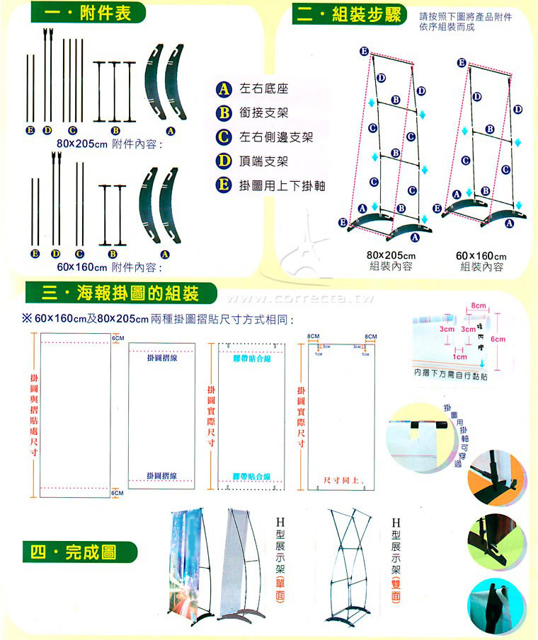 PS. 未裝上海報前的H型空架會鬆鬆的屬於正常現象,一定需藉由海報拉力才能支撐穩固;自行輸出海報上下需多留6公分以便施工時反摺黏貼,也可代客輸出海報,歡迎來電洽詢02-22679097.