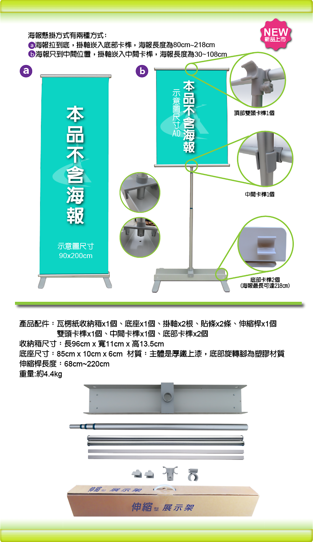 新型台製海報展示架底座採雙T型腳架,展開後穩固耐用,空架約4.4kg